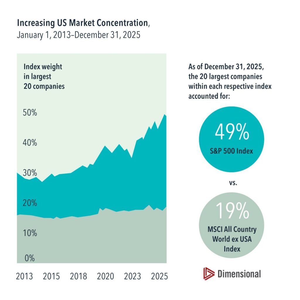 Taking a global perspective can help mitigate concentration concerns. The largest stocks represent a smaller share of markets outside the US, and that share has risen at a slower rate. At the end of 2025, the largest 20 stocks accounted for just 19% of the MSCI All Country World ex USA Index, a modest increase from approximately 16% at the start of 2013.